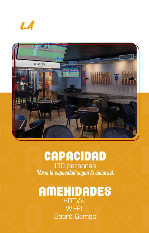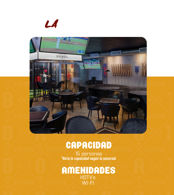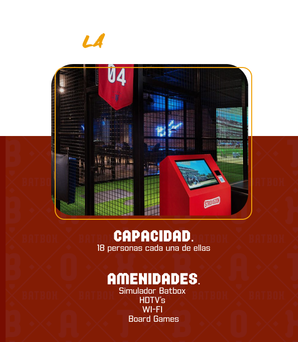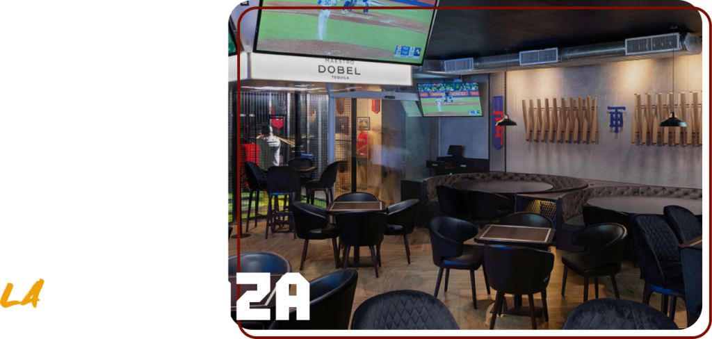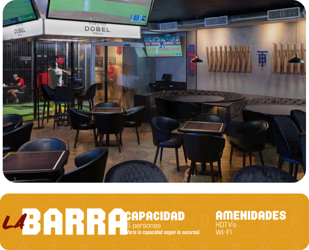 Tenemos una variedad de espacios para que disfruten del evento, contamos con nuestros diferentes simuladores de baseball, donde pueden divertirse, una increible terraza donde disfrutarán de platillos diferentes; dependiendo los que mejor se adapten a gustos y necesidades del cliente.
